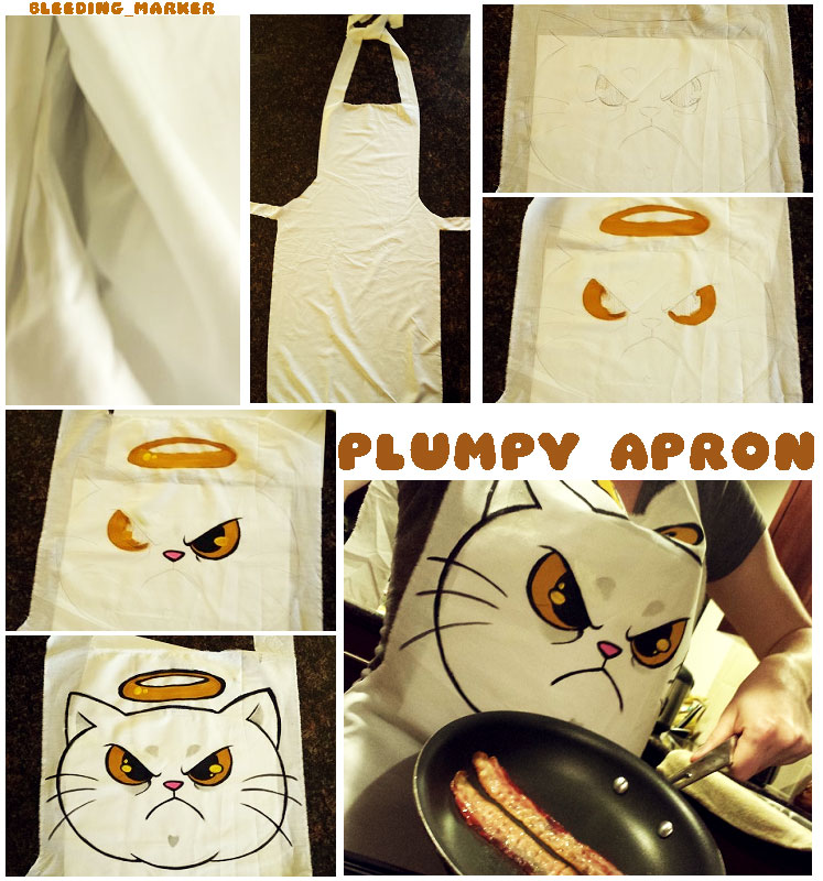 "Where's my Bacon!?" Apron by bleeding_marker First off, what I loved about making this apron was there is no sewing involved. So if you love Plumpys as much as I do its a fun and easy project. Materials: Large white sheet, scissors, acrylic paint, paint brush. Every morning I make bacon for breakfast, so I thought this was the perfect character to help me cook. I just took a large white sheet, drew a very simple apron outline. Cut the fabric around the outline. Once my apron had its shape I drew on an adorable happy Plumpy face. Next I painted in the golden/pink colors. When that dried I outlined the Plumpys features in black acrylic paint. Vuala! Your Plumpy apron is complete! Bacon sold separately.