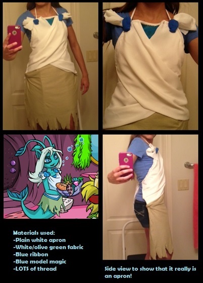 Underwater Cooking! by messyjessy904 What a fun project! This Isca-themed apron will make the wearer feel positively magical, regardless of whether they decide to cook on land or in the sea! I started out with a simple white apron - everything in the final product is hand-sewn on, and the draping effect of Isca's wraparound top was actually more difficult to achieve than it looks. I cut two long strips of fabric, sewed the bottom layer to one side, and then sewed the top layer above it. The "ruffles" were created by sewing over the wrinkles in the fabric. Overall, I think it's an apron that Isca would be proud of. =)