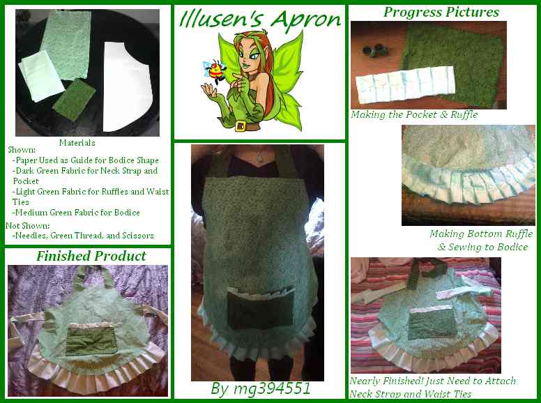 Cooking With Friends by mg394551 For the Cooking With Friends Random Contest I made an Illusen inspired apron. This is the type of apron I would imagine Illusen using while whipping up a batch of Illusens Cream Cookies! The apron has Illusens classic Earth Faerie tones of green, with a earthy floral print. I sewed this apron entirely by hand with a needle and thread. It is made of 3 different colors of flame resistant cotton fabric. It features a cute ruffle on the front pocket and bottom. I stapled 3 pieces of paper together and cut out the bodice shape I wanted for use as a template.